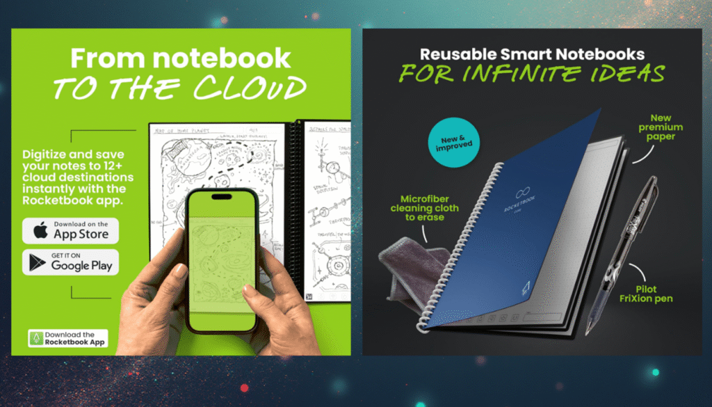 Rocketbook is a smart, reusable notebook that blends the feel of pen and paper with the convenience of digital organization. It features premium erasable pages, a scratch-resistant cover, and Smart Titles and Tags to keep your notes organized. Simply write with the included Pilot Frixion Pen, scan your notes to cloud services like Google Drive or Dropbox, then wipe the pages clean to reuse them.